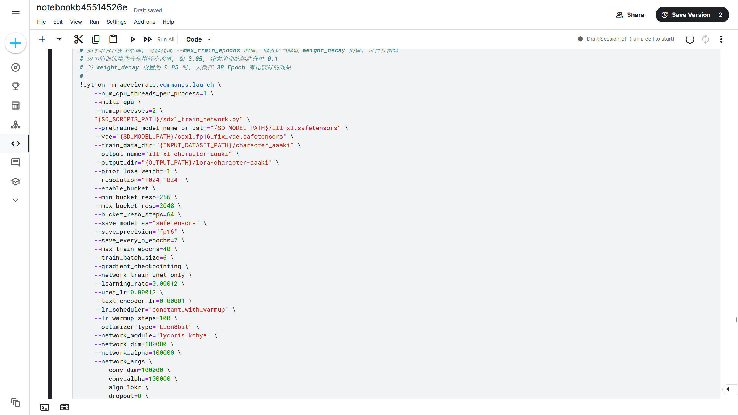 现在修改一下大模型路径和训练集路径,即--pretrained_model_name_or_path和--train_data_dir的值,路径根据前面选择的方法得到的路径来选择。比如大模型路径为SD_MODEL_PATH/ill-xl.safetensors,训练集路径为{INPUT_DATASET_PATH}/character_aaaki,则修改后对应的参数为--pretrained_model_name_or_path="{SD_MODEL_PATH}/ill-xl.safetensors"和--train_data_dir="{INPUT_DATASET_PATH}/character_aaaki"。注意这里的{SD_MODEL_PATH}和{INPUT_DATASET_PATH}为变量,在 Jupyter Notebook 的 Shell 调用方法中需要加上{}符号将变量中的值解析为对应的内容。