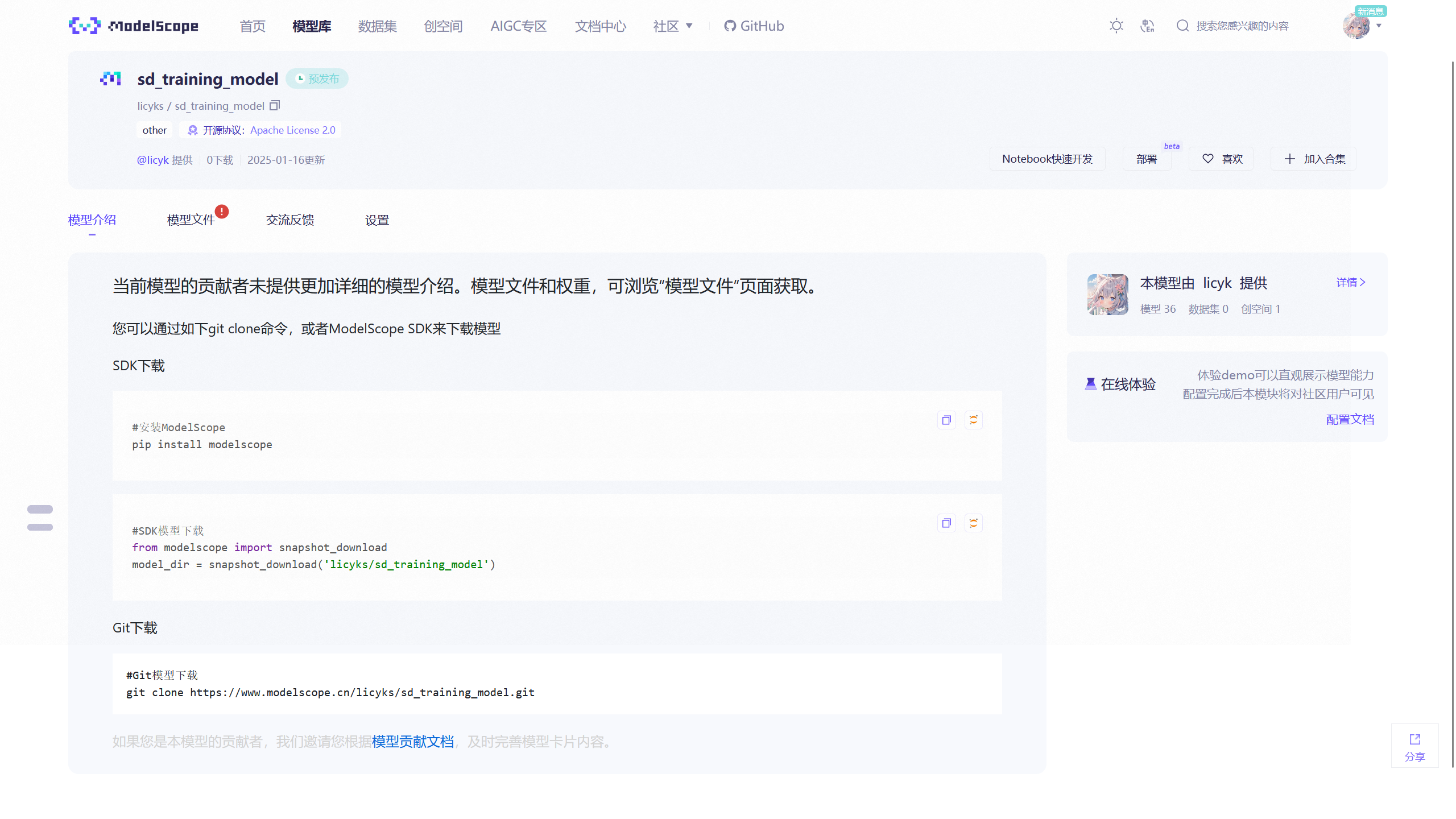 此时在 HuggingFace 上创建的模型仓库 ID 为licyk/sd_training_model,在 ModelScope 上创建的模型仓库 ID 为licyks/sd_training_model。