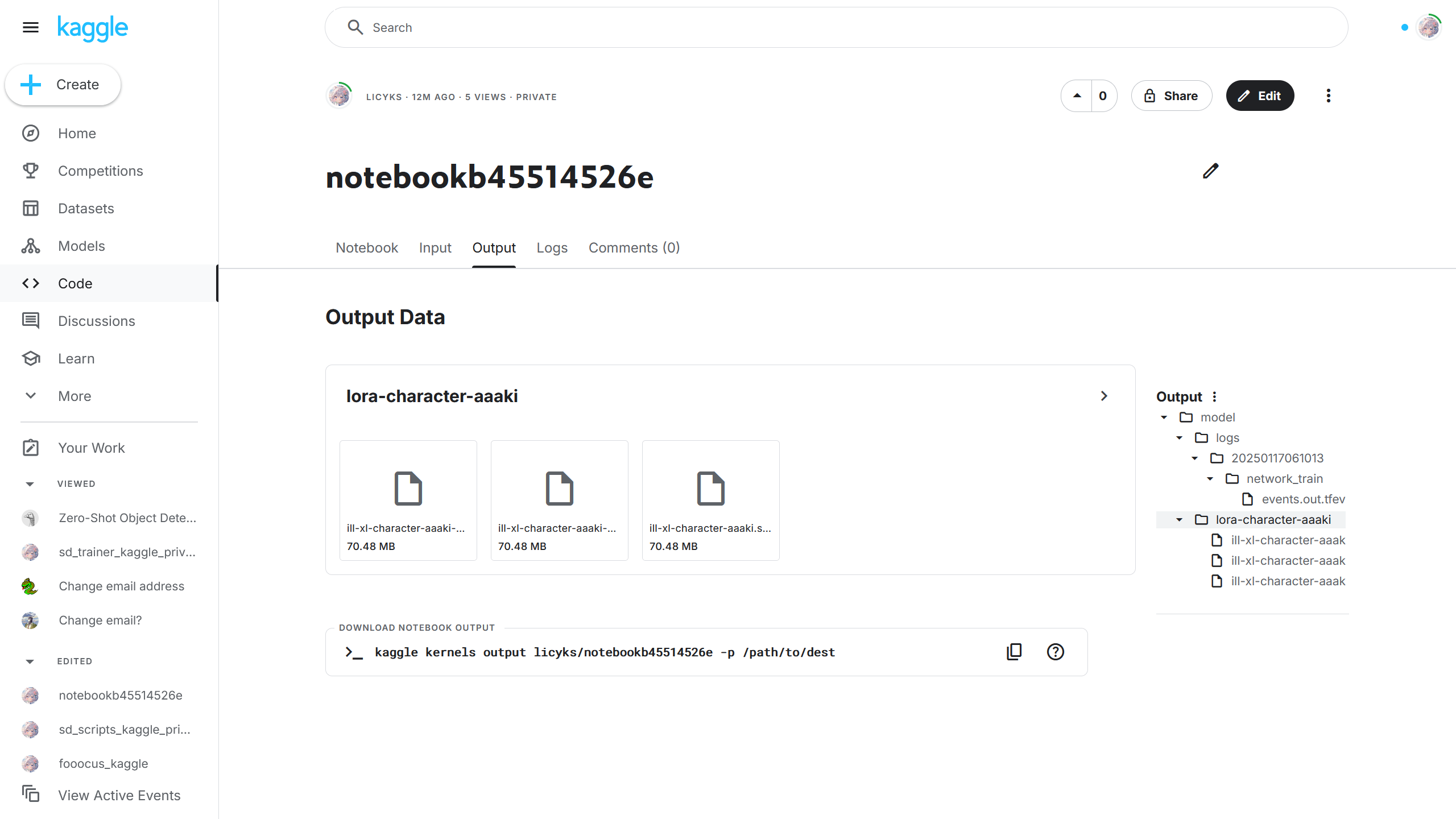 如果训练成功后,可以在 Kaggle Output(Kaggle 输出)中查看训练好的模型,选择其中一个模型后可以下载该模型。