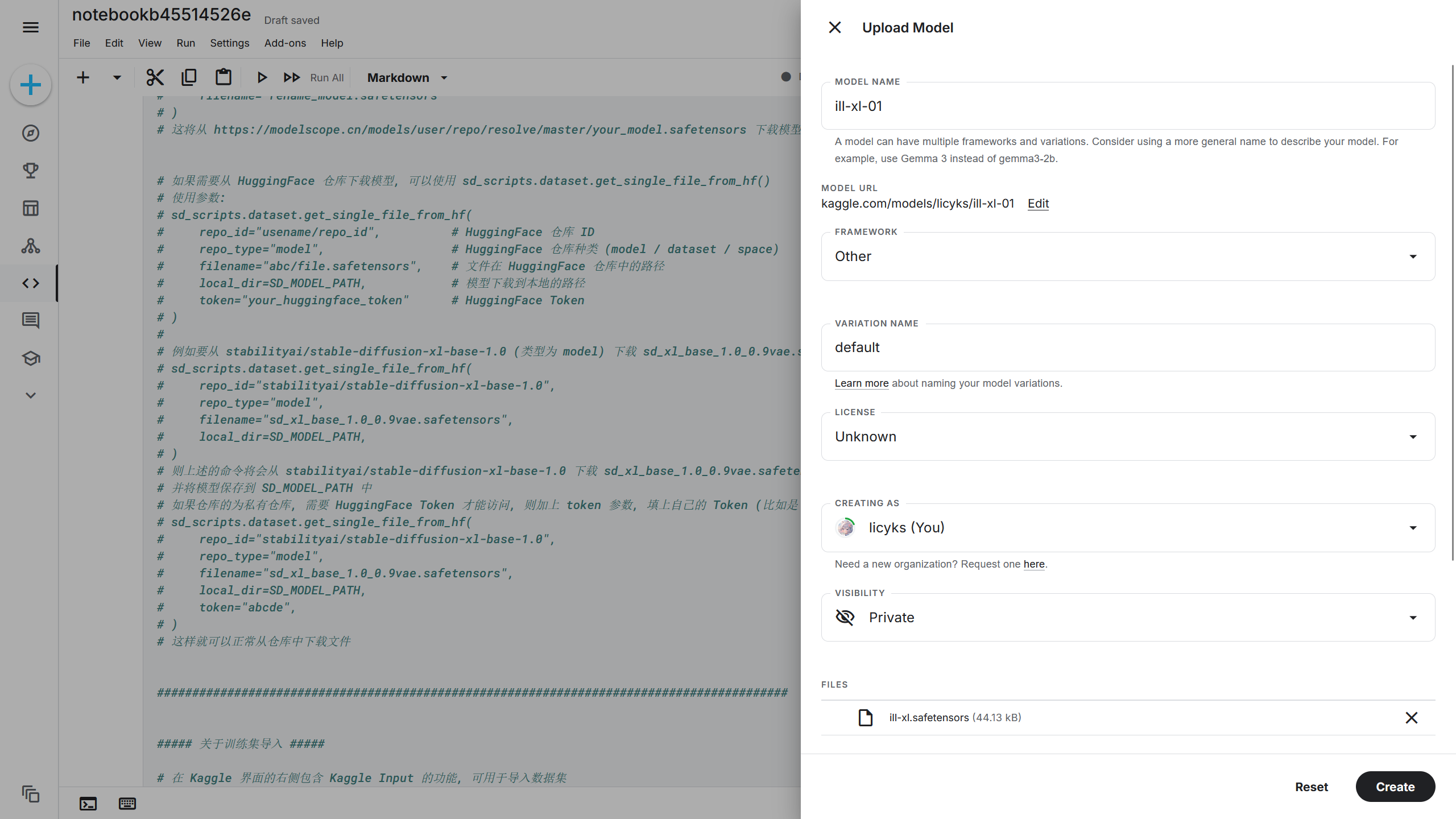 在右侧的 Kaggle Input(Kaggle 导入工具)支持上传自己的模型到 Kaggle 中,在 Notebook(笔记本)-> Input(导入)-> Upload(上传)-> New Model(新建模型),在模型上传界面选择要上传的模型,此时将弹出模型信息设置界面。MODEL NAME(模型名称)填写模型的名称,这将决定模型所在的文件夹名称,这里我设置成ill-xl-01,FRAMEWORK(框架)选择 Other,LICENSE(许可证)选择 Unknown,如果还有其他需要上传的模型,可以在下方继续选择模型,配置完成后点击 Create(创建)上传模型。